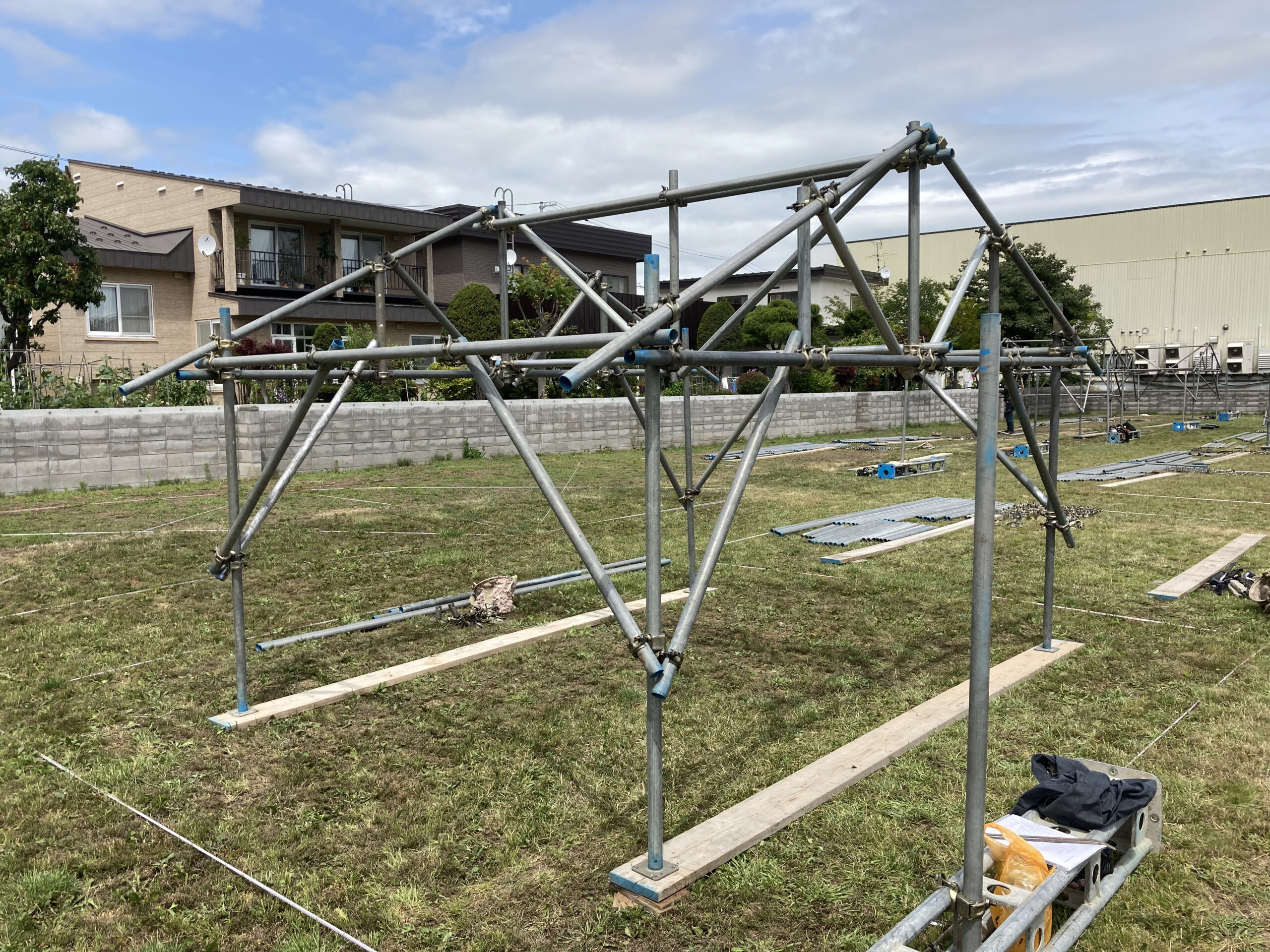 クランプの締め忘れがあると、危険なので「参加者全員で即刻、解体」するよう指示が出て、即時解体されます。材料は使い切る数しか用意されていません。また、クランプなどの個数は試験直前に自ら点検。不良品があれば交換を願い出る必要があります。
